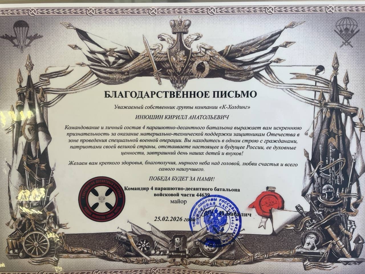 К-Холдинг продолжает системную работу в рамках социальной и благотворительной деятельности, направленной на поддержку тех, кто сегодня выполняет задачи особой важности. В этот раз помощь была оказана 4 парашютно-десантному батальону войсковой части 44639.